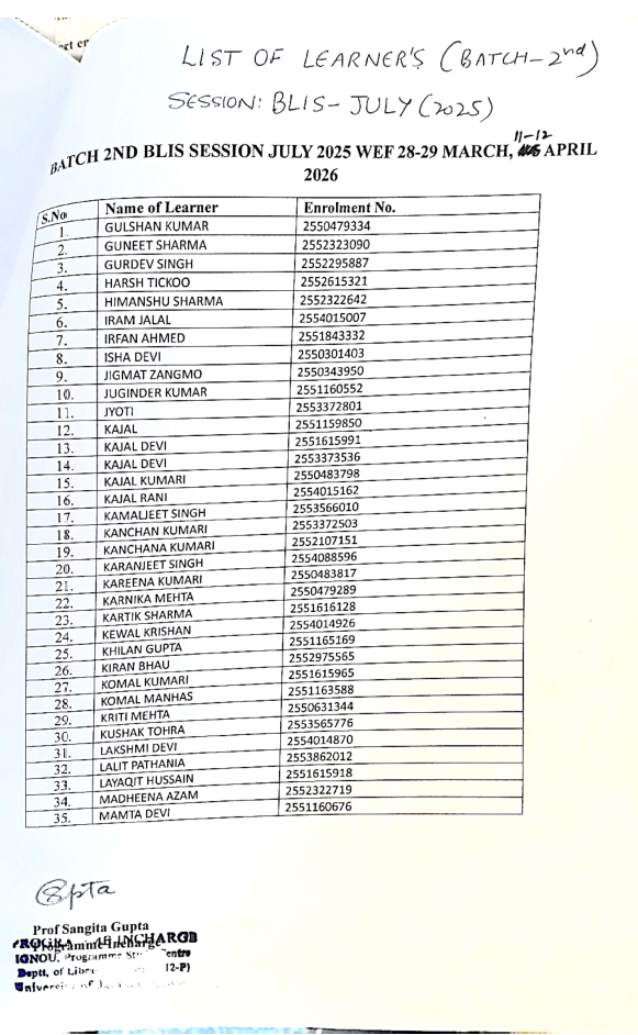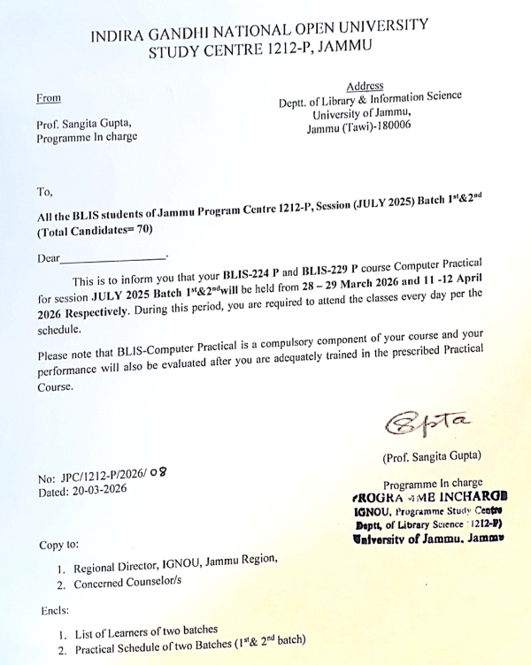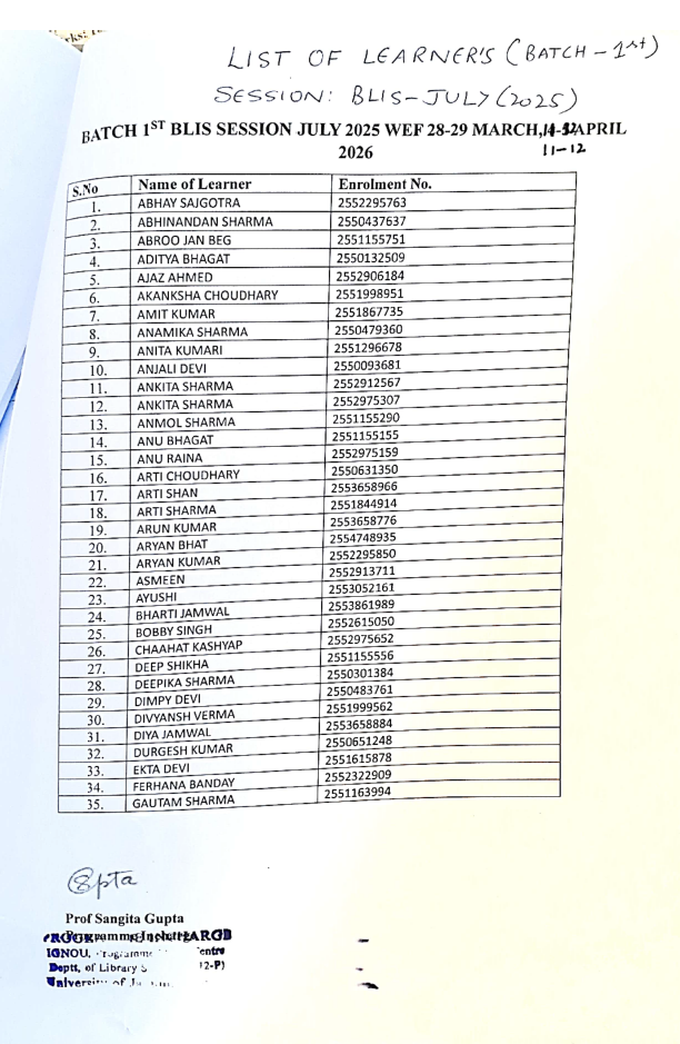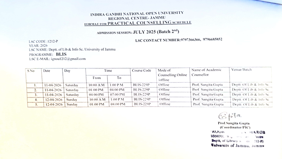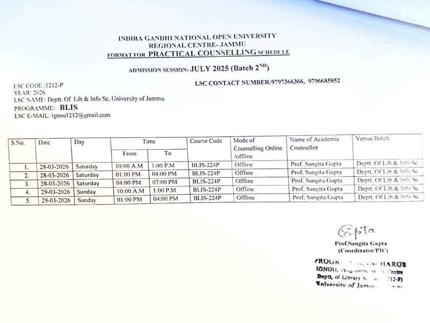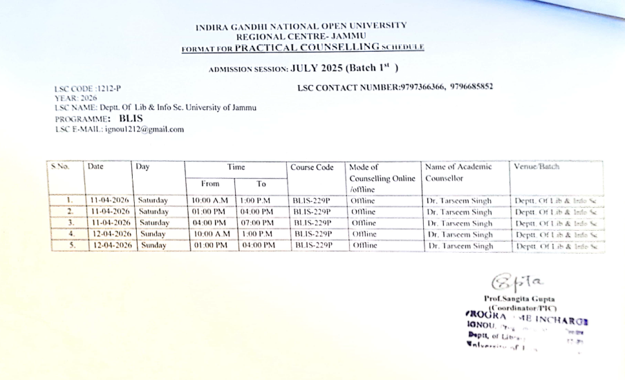 Schedule for Counselling Session of BLIS learners (Batch 1st and 2nd) of session July 2025 commencing from 28-29 March and 11-12 April 2026